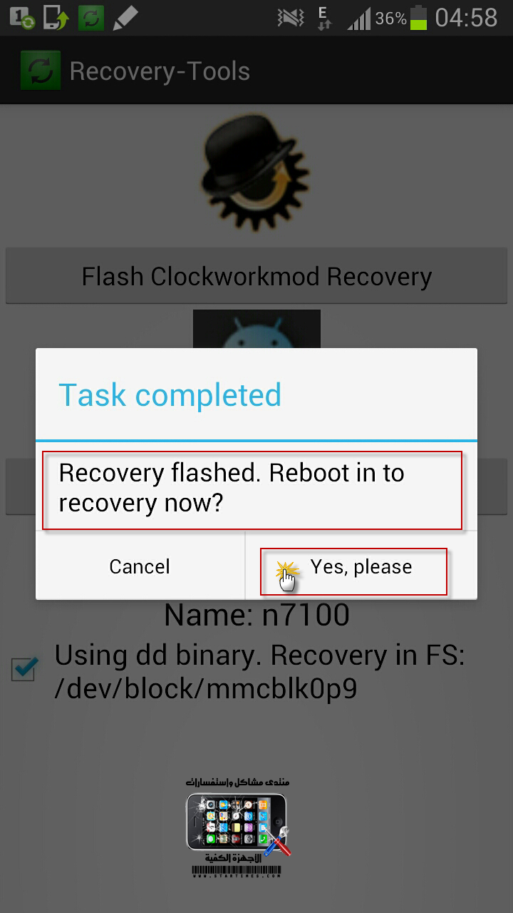 اذا ظهرت لك رسالة قبل هذه تطلب منك عمل باك اب تجاوها فقط ، ستظهر لك هذه تطلب منك تأكيد تحميل ملف الريكفري ، اضغط كما تشير الصورة