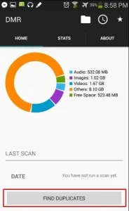 1- فقط قم بتحميل وتثبيت تطبيق Duplicate Media Remover على هاتفك الاندرويد ( ستجد رابط التحميل اسفل المقال ) وبعد فتحه ستظهر لك الواجهة التالية قم بالضغط FIND DUPLICATED على كما توضح الصورة التالية :