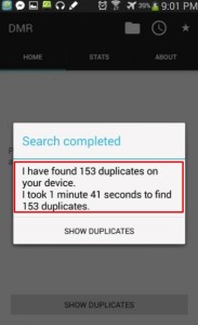 2- تنتظر بعض الوقت حتى تتم عملية ال Scanعن الملفات المتكررة ، ربما تحتاج العملية إلى مدة طويلة في حالة إذا كانت الملفات الموجودة بهاتفك بمساحة وحجم كبير ، بعد الانتظار سيظهر لك عدد الملفات المتكرر كما تري بالصورة التالية :