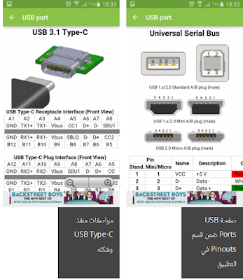 كمثال، سيجد المستخدم عرضًا لأنواع وصلات USB المختلفة مع أشكالها ومعنى