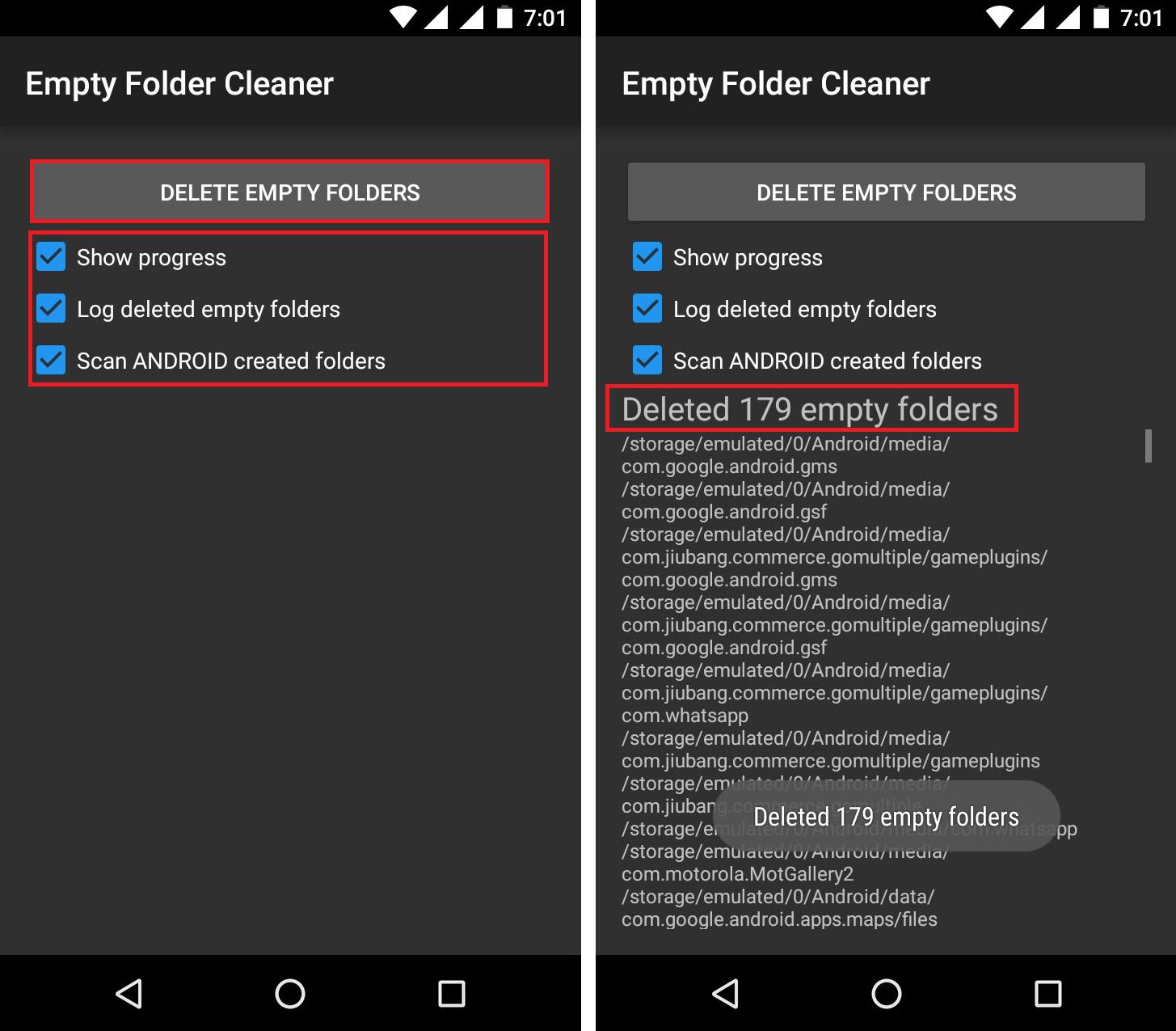 3- مسح مجلدات أندرويد المنشأة : لن يحذف المجلدات الفارغة من الدلائل: /Android/data, /LOST.DIR