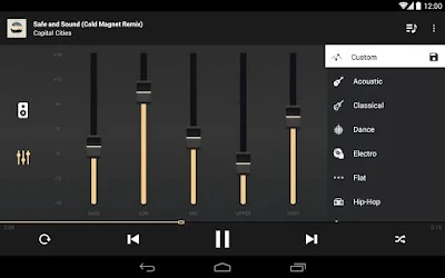 ثانياً : تختار Music أو الموسيقى وبهذا يفتح كل الملفات الصوتية الموجودة على هاتفك من خلال التطبيق و بعدها عليك إختيار إي ملف تريد سماعه وبعدها تجد كانه Equalizer او ميكسر صوت و تجد المفاتيح في المنتصف كما موضح أمامكم في الصورة التالية :